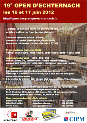 Nous avons reçu une invitation de la part du club d’échecs De Sprenger Echternach pour la 19ème édition de l’Open International d’Echternach qui aura lieu les 16 et 17 juin 2012.