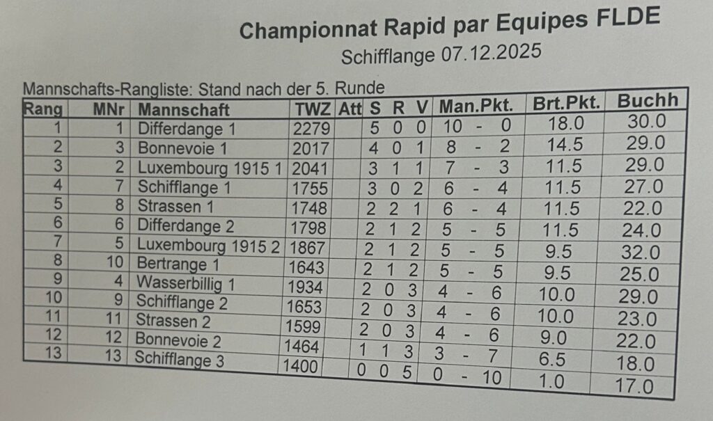 Gambit Bonnevoie I (Bednarich, Meyer, Stern, Vijups) got the second place at the national rapid championship for teams, with Differdange on the top of the podium and Luxembourg 1915 winning bronze. Our young players from Bonnevoie 2 gained valuable experience. The national championship took place in Schifflange on 7/12/2025.